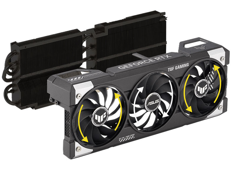 در برد کارت گرافیک ایسوس سری TUF Gaming GeForce RTX 50 برای پر کردن موثر شکافهای بین پردازنده گرافیکی و ماژول حرارتی، یک پد حرارتی GPU با تغییر فاز ممتاز، رسانایی حرارتی برتر و دفع حرارت بهبود یافته را فراهم میکند و عملکرد بهینه و طول عمر کارتهای گرافیک را تحت بارهای سنگین تضمین میکند و با خنککننده و توانرسانی بهبود یافته ارتقا یافته و با تقویتکنندههای قوی برای دوام استثنایی تقویت شده است.