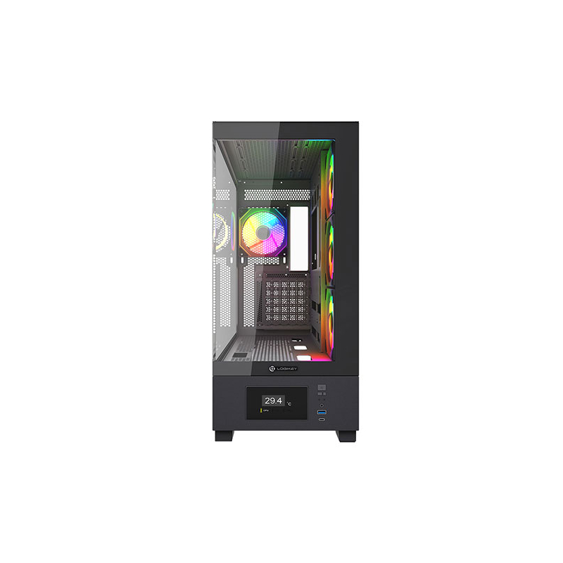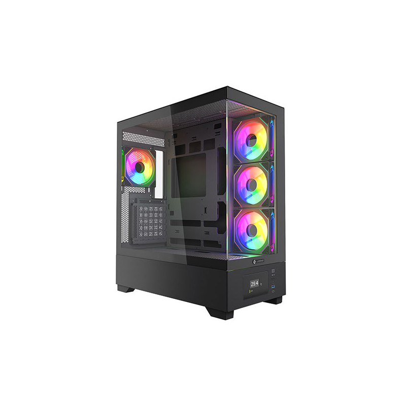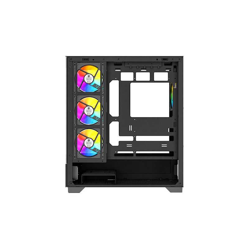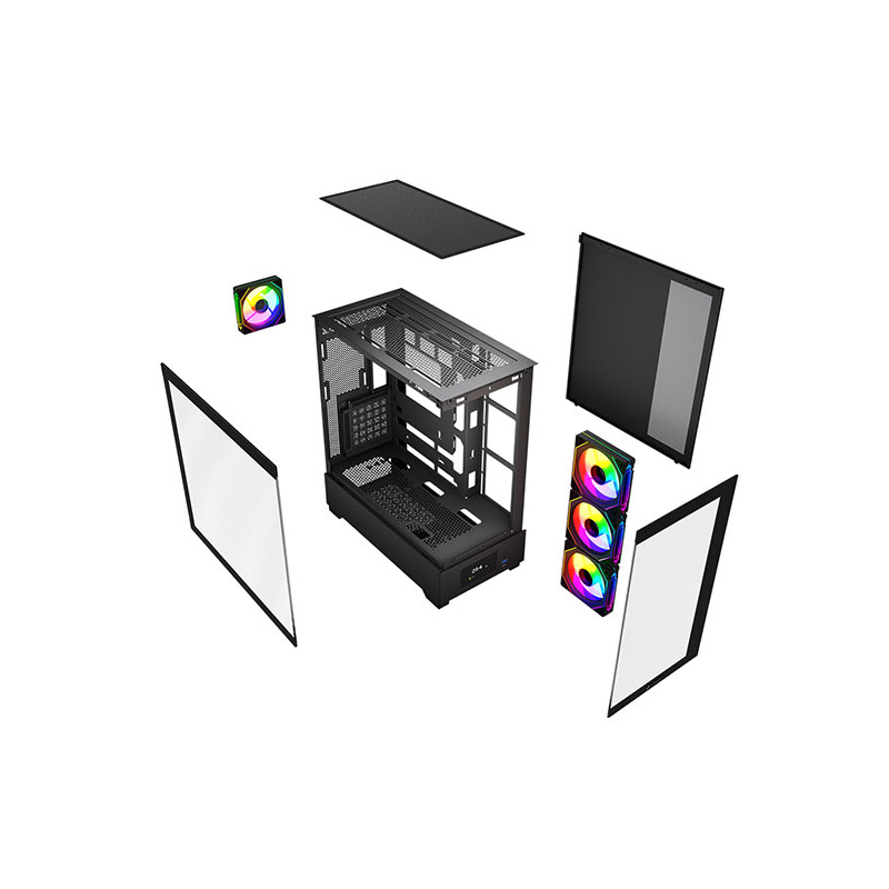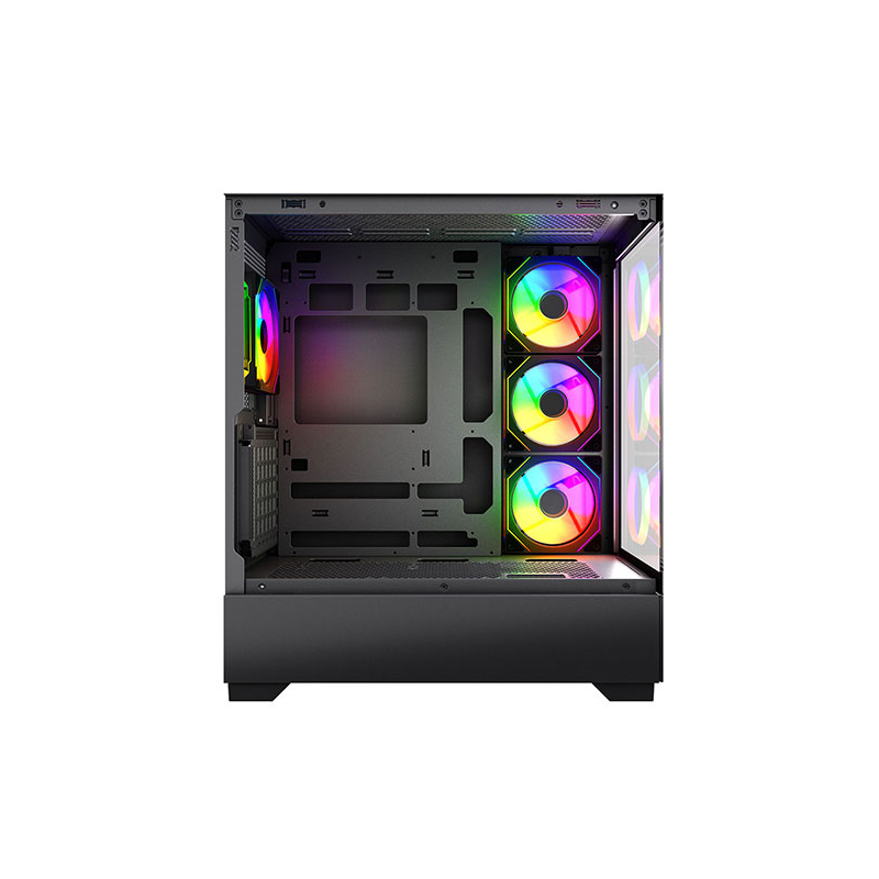 این کیس دارای درب شیشه ای حرارت دیده شفاف در قسمت های جلو و کنار و 4 فن بزرگ 120mm نصب شده با نورپردازی ARGB بسیار چشم نواز در پنل های کناری و پشت کیس است بطوری که زیبایی و عظمت تمام رخ قطعات نصب شده را به نمایش می گذارد.